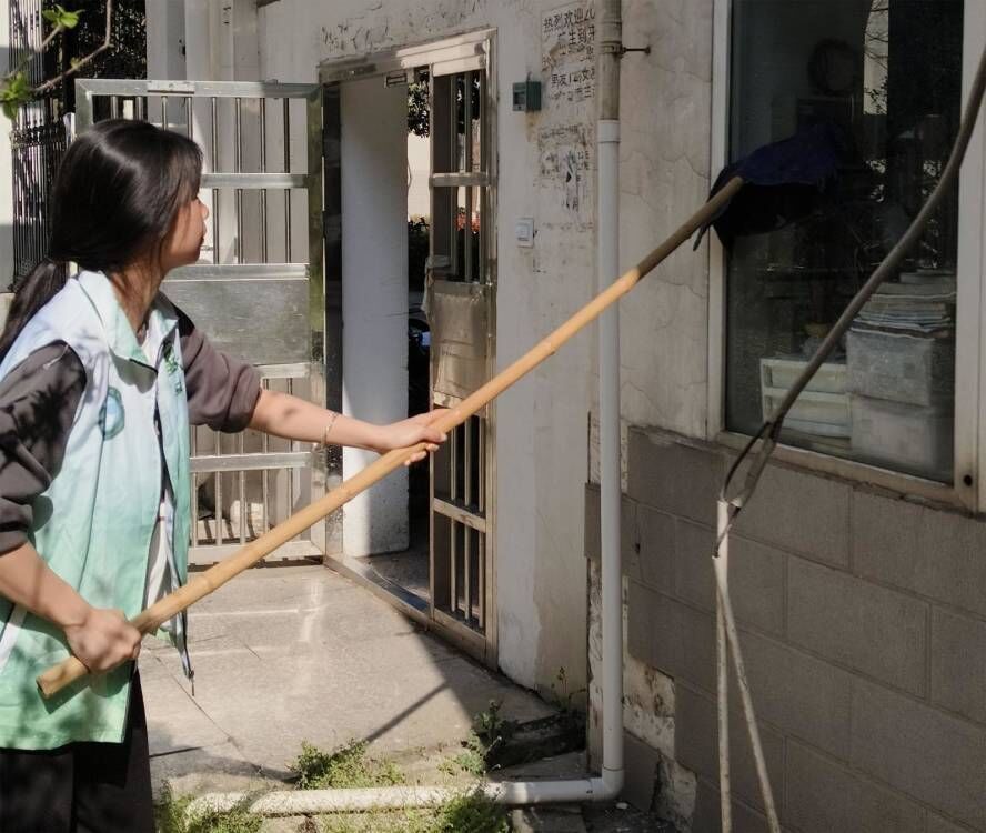 现场教学后,学生拿上擦玻璃工具,两人分工合作共擦一扇窗户。钢丝球清除顽固污渍,毛巾抹玻璃,报纸清除水渍。一遍又一遍的操作流程,一扇又一扇的窗户玻璃,学生也由开始的技术生疏变得技术娴熟。“阿姨都还没擦过像你们这样亮的玻璃呢!”对于田芳毫不吝啬的赞美,学生的脸上也露出了劳动的自豪感与得到他人肯定的幸福感。