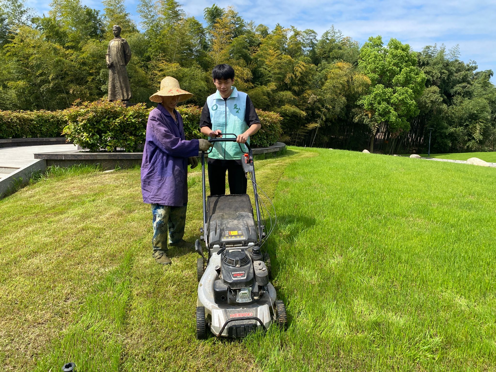 志愿者们分成三个小组跟随廉园的师傅们开始推草工作。谭武全也参与到劳动中来,体验廉园修理草坪劳动者的一天。其中财管2202班郭其闱和财管2202班刘卓尔在许师傅的指引开始推草工作。 “当我们清理角落的杂草时,放开后面的拉杆,小心地调转除草机方向。”许师傅提醒到。